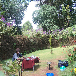 At 9 AM we arrived back at base camp with dirty wobbly legs. Our tents wee still erect and the sun was warm and bright. It was a homey feeling. I changed down to cleaner dry clothes to prepare for the hike down to Mweka Camp some maybe 6 miles away all down hill. We snacked on tea and cookies and headed back down at 10:25 AM.